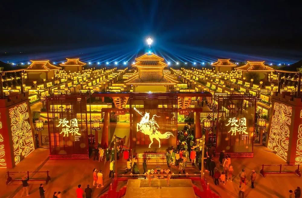 1. 九曲黃河燈陣:占地150畝,全長2.4公里,按九宮八卦布局九大殿(關公殿、元始天尊殿等),設365桿旗、365盞燈對應全年天數,700余面文化墻融合二十四節氣、十二生肖、二十八星宿等傳統文化元素,夜間燈光秀與實景演藝《張國臂掖》結合,打造沉浸式漢唐市井體驗。
