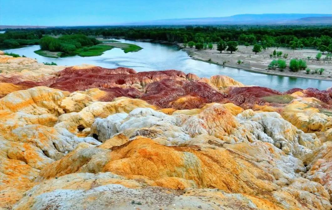 • 特色:以“一河隔兩岸”奇觀聞名——北岸雅丹地貌色彩斑斕(紅/綠/紫/黃/棕),南岸河谷綠洲森林茂密,額爾齊斯河穿流其間,形成“半邊火焰半邊森林”的魔幻畫面。