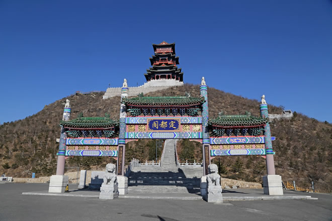 定都閣景區位于北京市門頭溝區潭柘寺鎮定都峰上,占地面積為550平方米,建筑面積約2400平方米,地上高度為33.9米,共有6層,外觀看為3層,為古色古香的中式建筑造型。定都峰,海拔680米,位于門頭溝區桑峪村東北獅山山頂,其位置正處在長安街向西的延長線上,是傳說中“燕王喜登定都峰,劉伯溫一夜建北京”的所在地。定都峰四周群山綿延逶迤,峻嶺疊嶂,山峰上巨石嶙峋,峰頂陡峭高懸,素有“不到定都峰,枉到北京城”和 “京西觀景第一峰”的美稱。傳說姚廣孝曾登頂定都峰,堪測地形再建北京,此后該山被稱為定都峰。明成祖朱棣登此山后曾感嘆不已:“此峰位之觀景之妙,無二可代,天賜也!”
