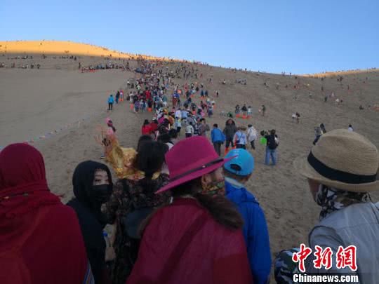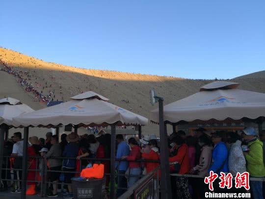 圖為8月中旬,鳴沙山月牙泉景區大批游客排隊登山。 馮志軍 攝
