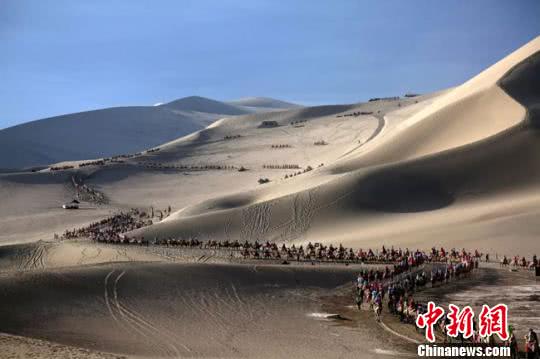 從早上6點至晚上8點,1200余峰駱駝延綿不斷地穿梭繞行于鳴沙山,出現了駝隊蜿蜒如長龍的壯觀景象。由于來敦游客猛增,鳴沙山月牙泉景區管理公司加大了安全監管和巡邏執勤力度,保證景區游客人身安全,游覽秩序井然。