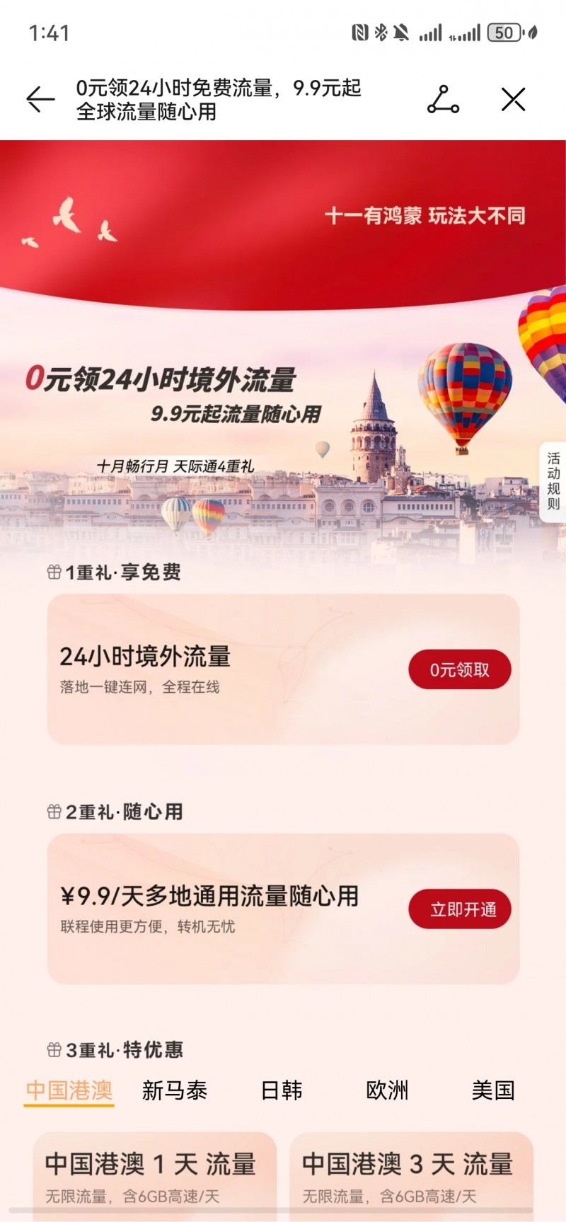 首先,天際通第一重禮·享免費——0元領24小時境外流量。從9月17日至10月31日,華為手機用戶登錄天際通APP首頁參與活動,即可享受0元領取24小時境外流量,覆蓋華人出行全球主流目的地,流量領取活動貫穿整個10月,用戶可在2025年9月28日至2026年3月31日啟用,滿足華為手機用戶境外出行上網需求,讓用戶零成本體驗天際通的高品質境外上網服務。