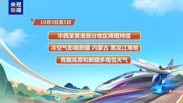 據中央氣象臺發布的消息,10月3日至5日,華西至黃淮一帶部分地區降雨持續,冷空氣影響我國新疆、內蒙古、黑龍江等地,青藏高原和新疆多雨雪天氣。公安部交通管理局提醒廣大駕駛人和出行群眾,注意關注沿途及目的地氣象部門預報預警信息。