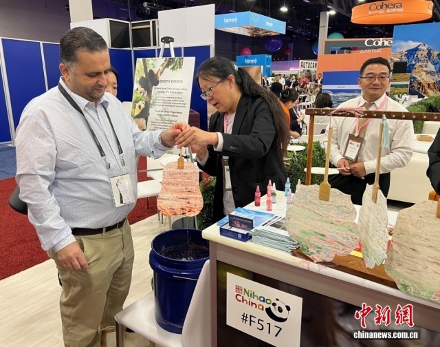 當地時間10月8日,2025年美國會議獎勵旅游展(IMEX America)繼續在拉斯維加斯舉行。這是全球會議及獎勵旅游領域最具影響力的展會之一。中國展臺舉辦“中華一刻”——中國非物質文化遺產體驗等豐富多彩的活動,吸引眾多與會者感受中華文化魅力。圖為與會者在中國展臺體驗漆扇制作。