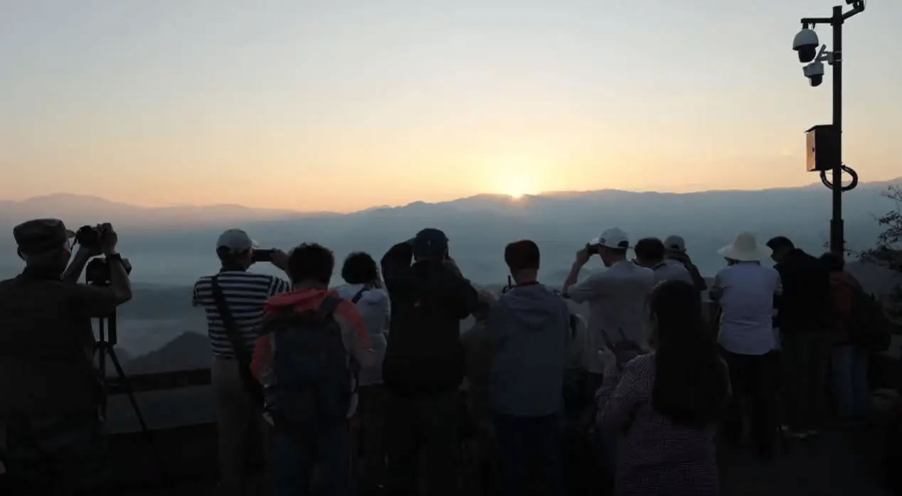 夜色未褪,寒意襲人,攝影師們背著專業(yè)設(shè)備,沿著登山步道向山頂進(jìn)發(fā)。當(dāng)?shù)谝豢|晨光穿透云層灑落在連綿的丹霞峰叢時(shí),赭紅色的山體仿佛披上了金色霞衣,在朝陽的映照下熠熠生輝。陡峭巖壁與平緩山脊勾勒出極具張力的線條,丹霞地貌雄渾壯闊的肌理盡顯無遺。快門聲此起彼伏,攝影師們或俯身調(diào)整參數(shù),或借助三腳架耐心捕捉光影變化,專注記錄每一個(gè)精彩瞬間。