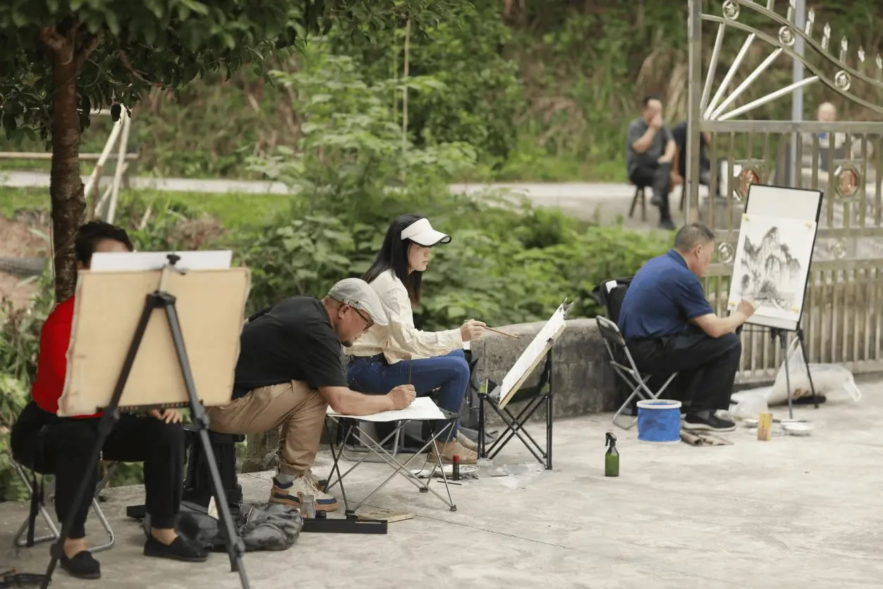 采風途中,藝術交流的氛圍格外濃厚。名家們時而圍站在一起,探討皴擦點染的技巧;時而各自凝神,將眼中的崀山轉化為筆下生動的線條與色塊。一幅幅即興創作的作品,在濃淡墨色的交融間,既展現了丹山碧水的壯闊,又傳遞了鄉村振興的蓬勃生機,讓崀山之美在宣紙絹素上綻放新韻。