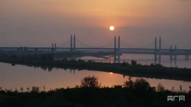 寧夏黃河濕地公園旁,黃昏時(shí)分橙紅落日西沉,橘粉色天際余暉傾灑在跨河大橋上,橋塔與拉索如巨人臂膀橫跨黃河,橋下黃河水波光粼粼與天空交相輝映,岸邊濕地植被靜默,飛鳥掠過(guò)蕩起漣漪,盡顯塞上江南黃昏盛景的詩(shī)意與壯美,令人沉醉。