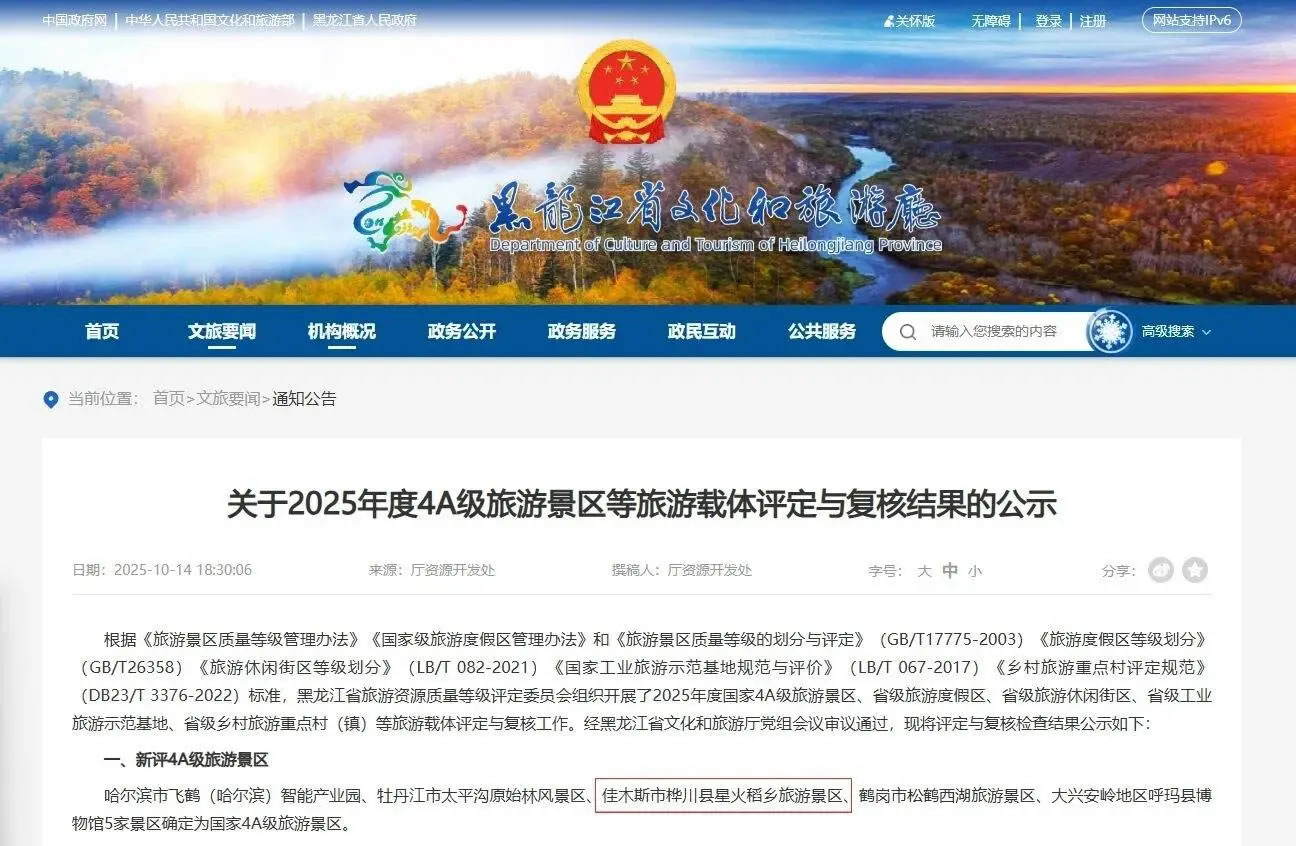 近日,黑龍江省文化和旅游廳發布2025年度AAAA級旅游景區評定與復核結果公示,樺川縣星火稻鄉旅游景區成功躋身國家AAAA級旅游景區行列。