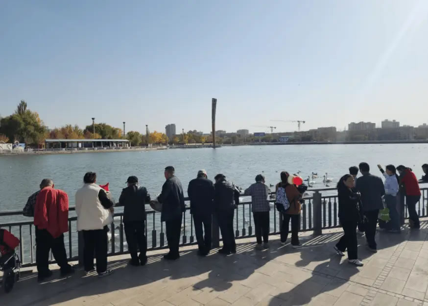 10月28日,在杜鵑河彭加木雕像水域附近,成群的天鵝和野鴨等鳥類在河面上游弋、嬉戲,潔白的天鵝與碧水、藍天、樓宇相映成趣,美輪美奐,吸引了不少市民和游客駐足欣賞,構成一幅自然和諧的生動畫卷。重慶游客張清揚說:“第一次來到庫爾勒,看到美麗的天鵝,心情都被治愈了,這是大自然的饋贈,庫爾勒的自然環境好,才會吸引這么多天鵝來這里過冬。”