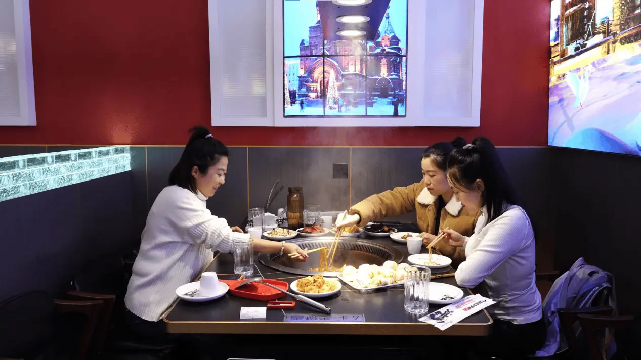走進同江市一家人氣很旺的鐵鍋燉餐館,濃郁的肉香混雜著酸菜的清爽撲面而來,鐵鍋里的大鵝與酸菜咕嘟作響,店內十余張餐桌座無虛席,食客們的談笑聲與鐵鍋的燉煮聲交織成冬日里熱鬧的煙火氣。這是同江商家搶抓冰雪季商機推出特色優惠套餐帶來的人氣。