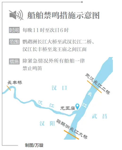 生態(tài)長江的底色愈加深厚。近日,武漢市首次在限定水域?qū)嵤┐耙归g噪聲管控。每晚11時(shí)至次日6時(shí),武漢市鸚鵡洲長江大橋至武漢長江二橋、漢江長豐橋至龍王廟之間,總長約20公里的江面進(jìn)入“靜音模式”,除緊急情況外所有船舶一律禁止鳴笛,為兩岸群眾營造優(yōu)質(zhì)夜間休息環(huán)境。