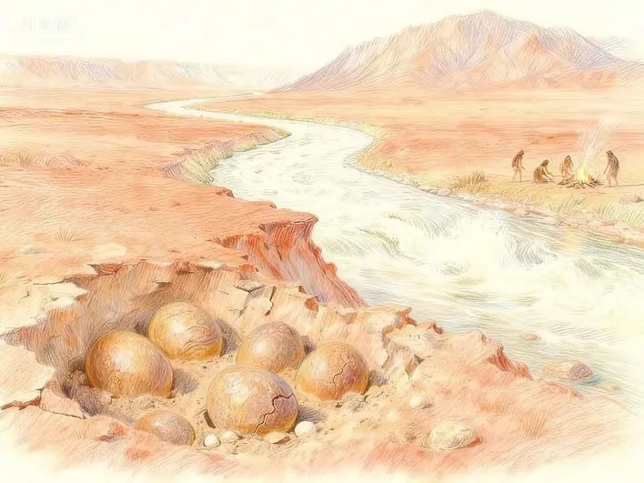 此次調查團隊負責人、湖北省地質科學研究院高級工程師趙璧介紹,科研人員長期對保護區內不明來源的鵝卵石存疑,而此次在恐龍蛋化石遺址更高處山體發現的大面積卵石層,終于解開這一謎題。這些卵石磨圓性好、呈定向排列,是典型的古河流階地沉積物。