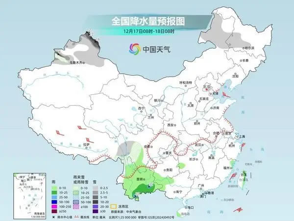 中央氣象臺預計,今天,內蒙古東北部、新疆北疆北部、西藏東部和北部、川西高原南部等地部分地區有小到中雪或雨夾雪,其中,新疆北疆北部局地有大到暴雪。西南地區東南部、廣西西部和南部、海南島、臺灣島東部等地部分地區有小雨。