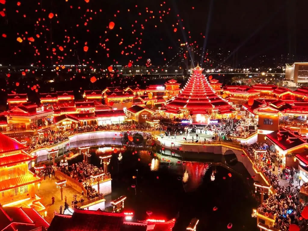 臨近午夜,榆樹灣·青春廣場迎來全天氛圍最高潮,游客們在孔明燈燈面上寫下新年愿望,在工作人員的指引下有序放飛。點點燈火隨風飄蕩,與夜空融為一體,構成“千盞飛燈映星河”的浪漫畫面。