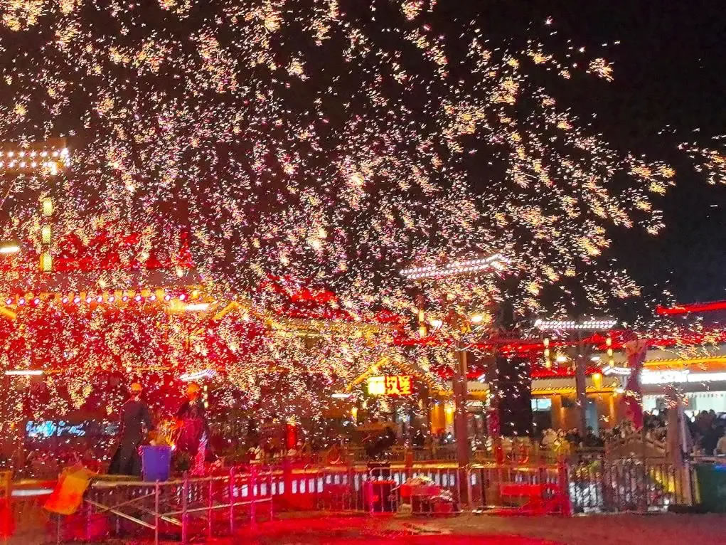 在湖南省懷化市鶴城區榆樹灣·青春廣場,一場“非遺+祈福”的盛典將節日氣氛推向高潮。元旦當天,儺面舞者隨著鼓點騰躍,神秘古樸;傳承人赤腳踏上36把鋼刀搭成的“刀山”,引來陣陣驚嘆。夜幕降臨,打鐵花表演現場,傳承人將鐵水拋向空中,再用木板奮力擊打,千點萬點金花四濺,打造出“火樹銀花不夜天”的絕美景象。