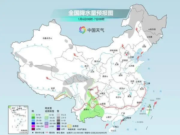 昨天,南方有大范圍雨雪現身,四川到長江中下游地區、華南北部地區以小雨或小雪為主,安徽、江蘇部分地區雨雪交雜。其中,安徽中部、貴州西部等地部分地區出現小雪或雨夾雪、局地中雪或大雪。