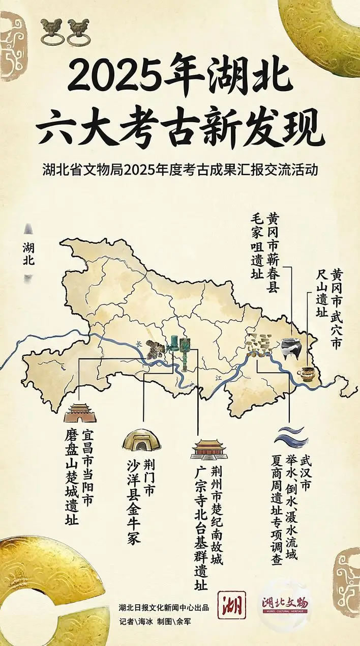 2月3日,在湖北省文物局舉辦的2025年度湖北省考古成果匯報交流活動上,正式公布了2025年湖北六大考古新發現。分別為:黃岡市武穴市尺山遺址、黃岡市蘄春縣毛家咀遺址、宜昌市當陽市磨盤山楚城遺址、荊州市楚紀南故城廣宗寺北臺基群遺址、荊門市沙洋縣金牛冢及武漢市舉水、倒水、灄水流域夏商周遺址專項調查。