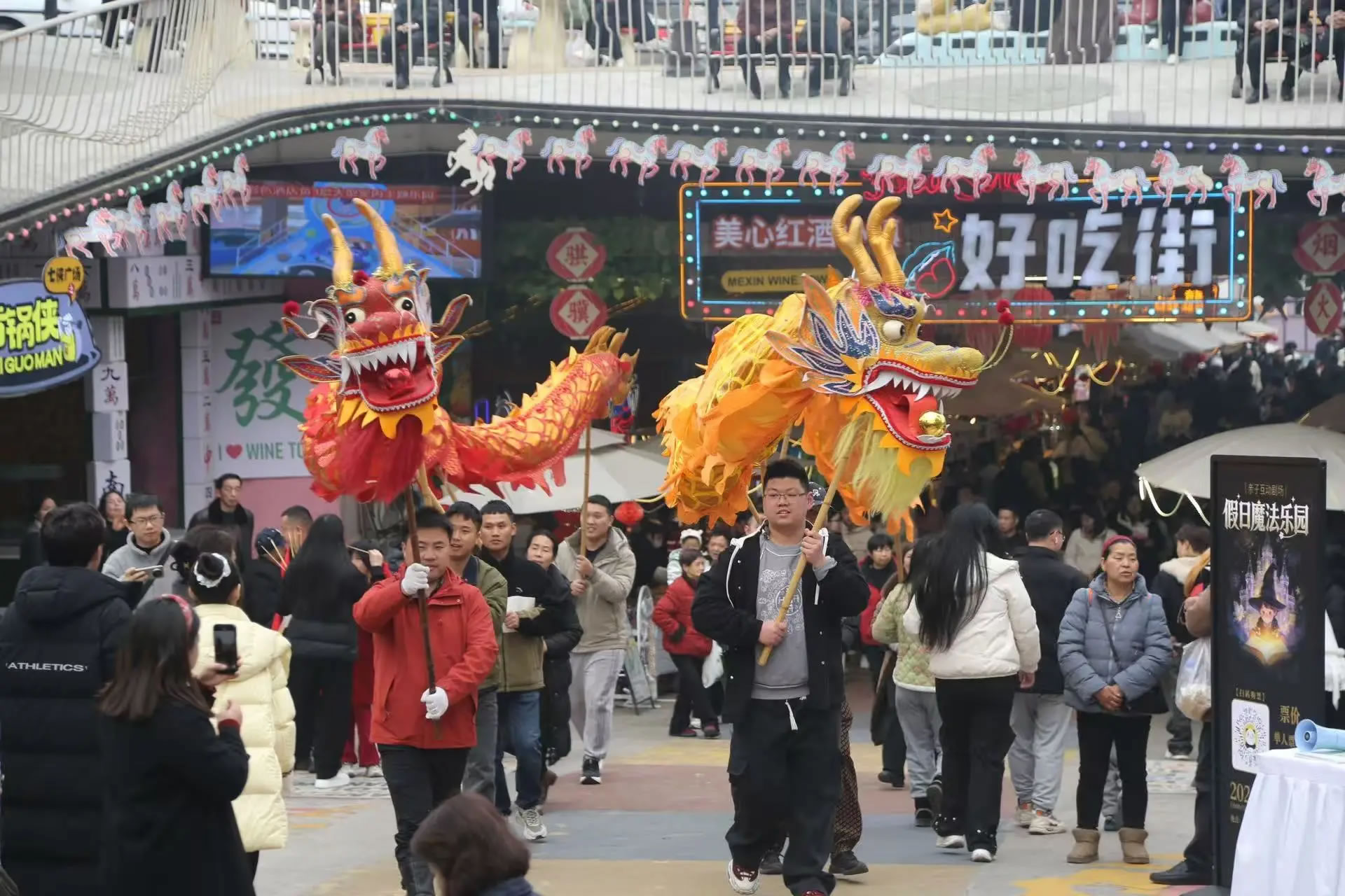 重慶歡樂谷舉行了新春大妙會活動,集水陸空立體非遺大秀、百場非遺演藝、多種民俗互動、年味萬福市集等于一體,以傳統(tǒng)與現(xiàn)代碰撞的獨特魅力為游客奉上沉浸式的地道年味體驗。其中,非遺大秀在夜幕中璀璨亮相,1600℃的鐵水揮灑成漫天花火,演員化身“天女”撒下花瓣雨,湖面的龍船、火鳳凰、風(fēng)火輪等裝置火光綻放,光影成趣,水陸空一體聯(lián)動,驚艷絕倫;川劇變臉、潮汕英歌舞、福建游神、電音三太子等百場非遺演藝,讓游客可一站式領(lǐng)略全國傳統(tǒng)文化魅力,吸引絡(luò)繹不絕的游客前往。