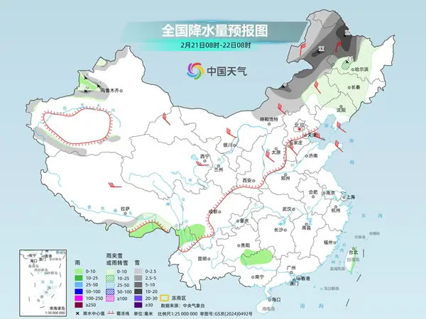 中央氣象臺預計,今天,內蒙古中東部、東北地區中西部、新疆伊犁河谷等地部分地區有小到中雪或雨夾雪,其中,內蒙古東北部和中部、黑龍江西部等地部分地區有大到暴雪。新疆伊犁河谷、西藏南部、四川南部、貴州東南部、云南西北部、廣西北部、臺灣島東部等地部分地區有小雨。