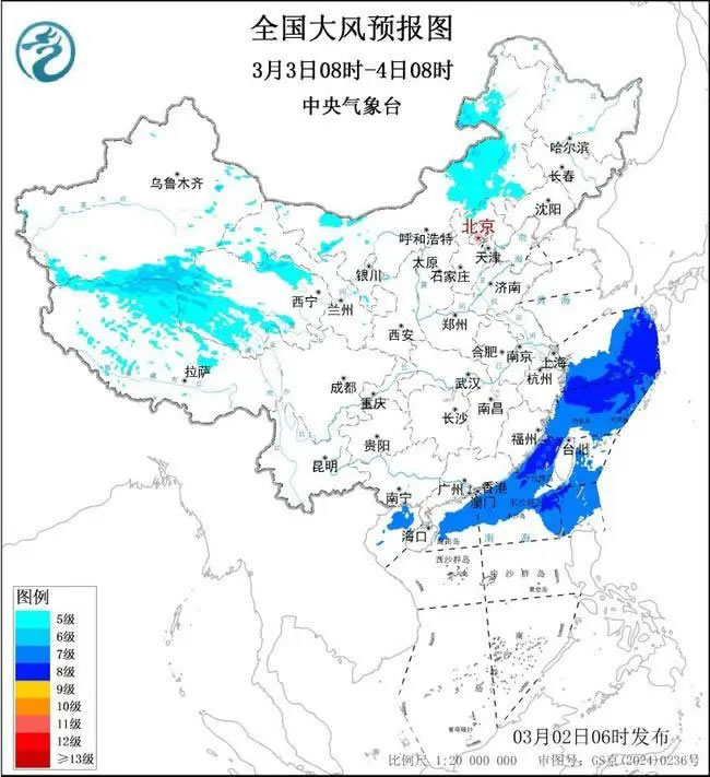 3月3日08時至4日08時,西藏北部、青海西部和東北部、內蒙古中東部等地將有5~6級、陣風7~8級的大風;東海大部海域、臺灣海峽、臺灣以東洋面、巴士海峽、南海北部海域將有7~8級、陣風9級的大風,其中臺灣海峽部分海域風力可達9級、陣風10級。