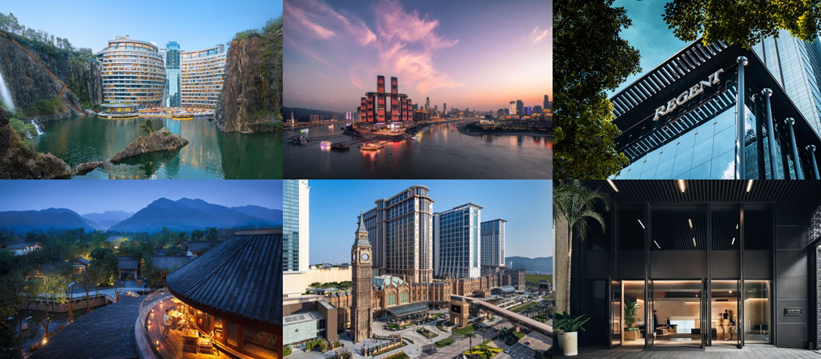 第一行從左至右:上海佘山世茂洲際酒店,重慶來(lái)福士洲際酒店,重慶麗晶酒店,