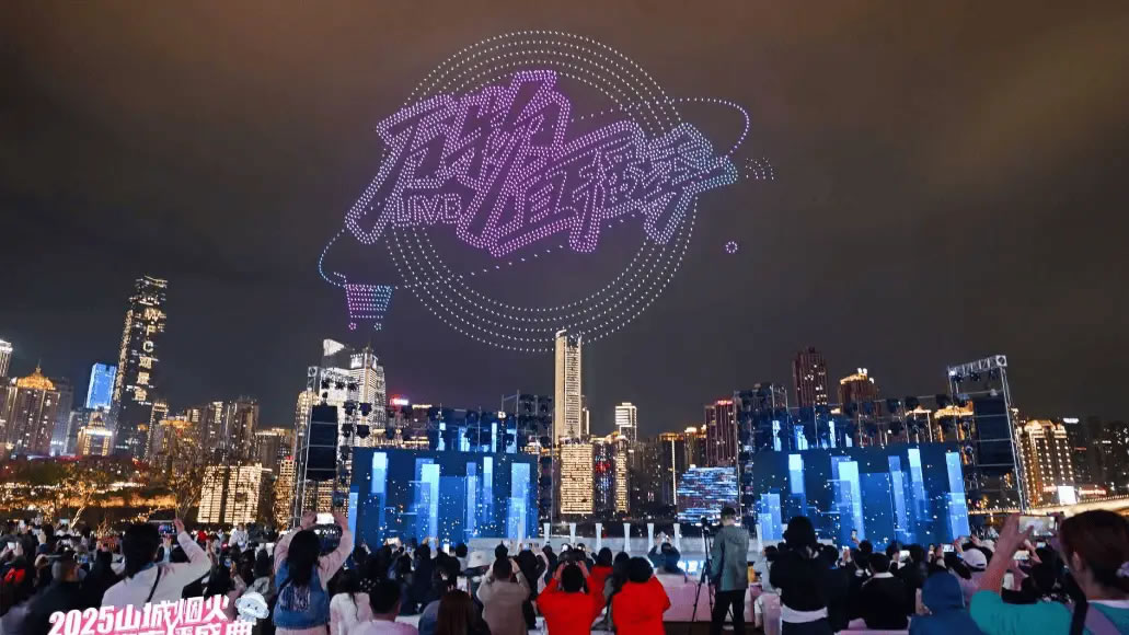 20時08分,五千架無人機騰空而起,在夜空中呈現“渝小e”“陳麻花”“萍姐火鍋”等定制畫面,將品牌故事升華為城市記憶。