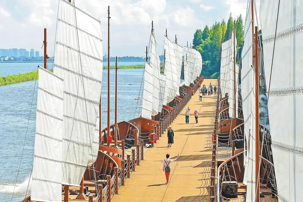 近日,昆明滇池綠道環草海段鋼浮橋重新向公眾開放。該橋是我省首座大型鋼浮橋,全長260米,以24組“帆船”造型藝術化再現“百舸爭流、千帆競發”的滇池古渡意象。該浮橋在2023年建成后曾對公眾開放過一段時間,后處于封閉狀態。此次重新開放,讓市民游客得以完整體驗環滇池的自然風光與人文景觀。圖為市民游客在鋼浮橋游覽。(記者 胡妤雅)