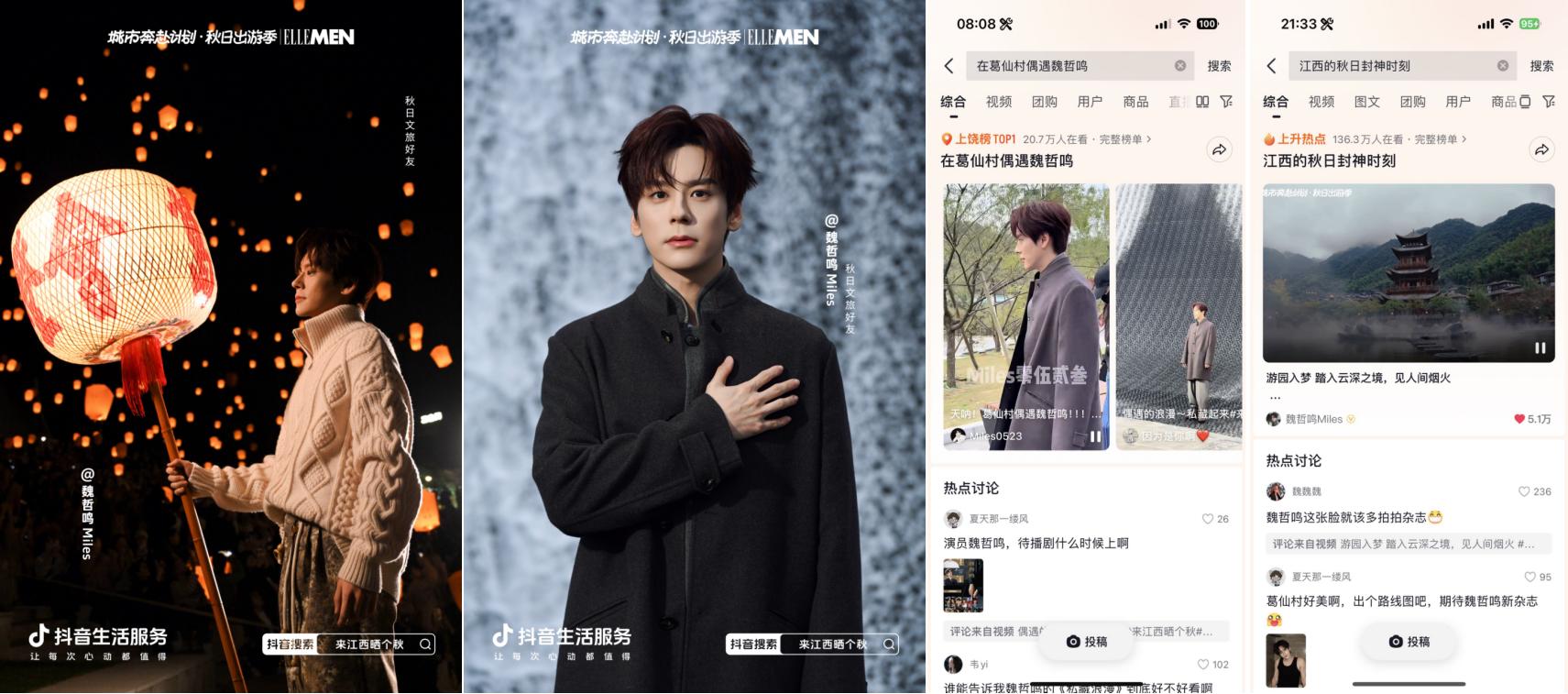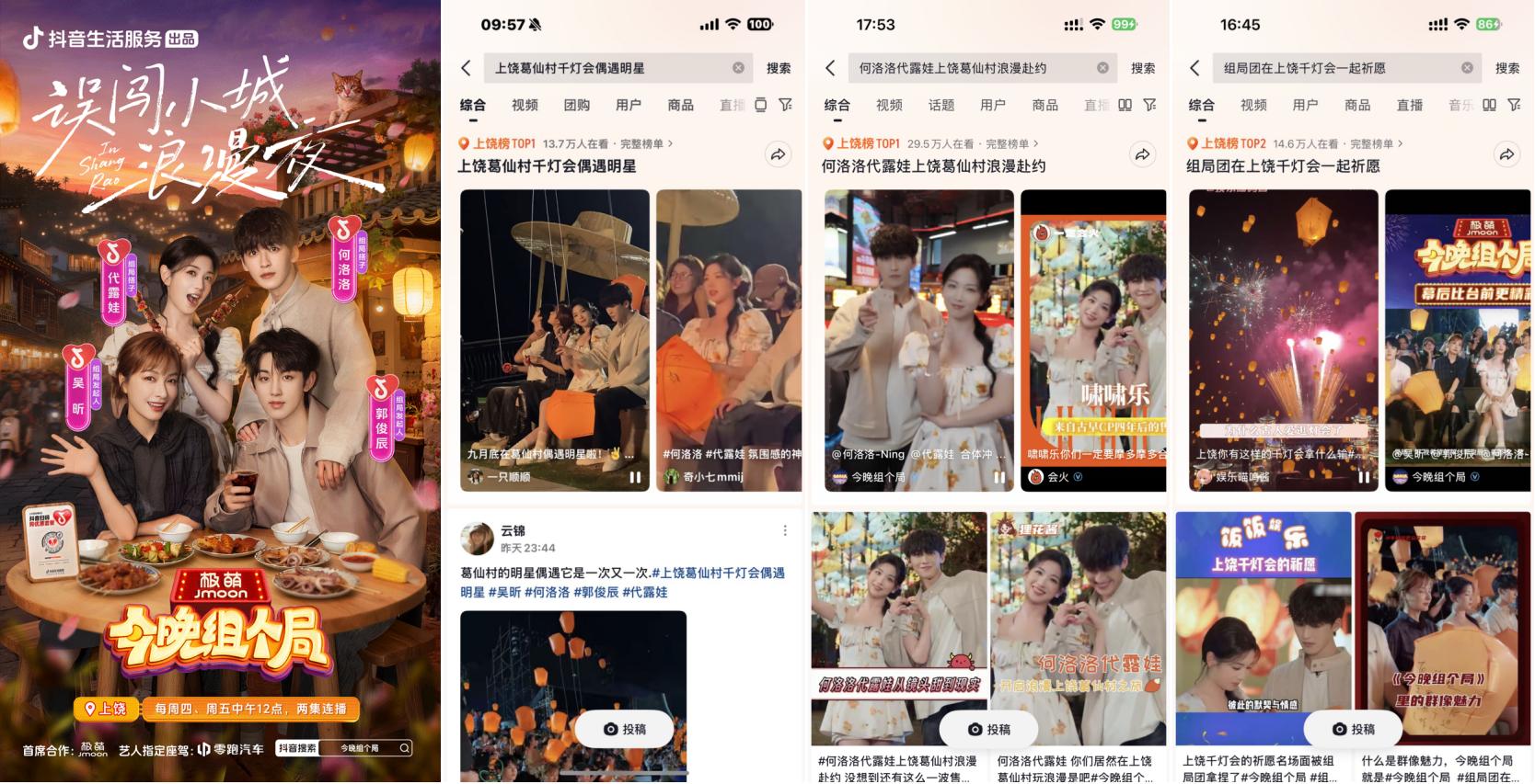 抖音牽手“秋日男友”魏哲鳴前往江西上饒葛仙村拍攝文旅宣發(fā)視頻引發(fā)廣泛關(guān)注,路透內(nèi)容#在葛仙村偶遇魏哲鳴 登上上饒同城榜TOP1;主視頻發(fā)布后,#江西的秋日封神時刻 更登頂同城榜及全國種草榜TOP6。活動還與綜藝《今晚組個局》實現(xiàn)聯(lián)動,吳昕、代露娃、郭俊辰、何洛洛等明星演員前往上饒拍攝定制化文旅內(nèi)容,#上饒葛仙村千燈會偶遇明星 #何洛洛代露娃上饒葛仙村浪漫赴約 等路透內(nèi)容與節(jié)目看點登頂上饒同城榜TOP1,#組局團在上饒千燈會一起祈愿 搶占同城榜TOP2。明星效應(yīng)有效激發(fā)用戶出行意愿,葛仙村交易額同比403%顯著增長,持續(xù)引爆目的地&商家出圈。