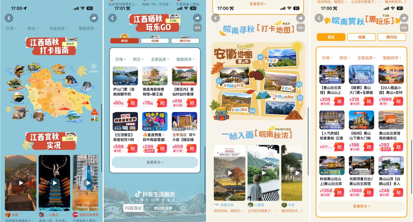抖音深度響應(yīng)用戶對季節(jié)限定體驗的需求,以“秋日儀式感”為切入點,聯(lián)動江西和安徽多城自然人文類商家,分別發(fā)起#來江西曬個秋 與#賞皖南秋意濃 話題活動,累計收獲話題總播放量2945萬,用戶投稿4275條,相關(guān)搜索UV突破406萬,同比增長19%。從江西婺源的篁嶺景區(qū)到安徽黃山的三塔景區(qū),從葛仙村的千燈夜游到三清山的云海勝景,抖音平臺的內(nèi)容生態(tài)與交易場景實現(xiàn)深度融合,推動江西與安徽兩地文旅目的地整體支付達GMV2.22億元,同比增長246%,讓從發(fā)現(xiàn)出行靈感至完成目的地消費的全過程更加順暢自然。
