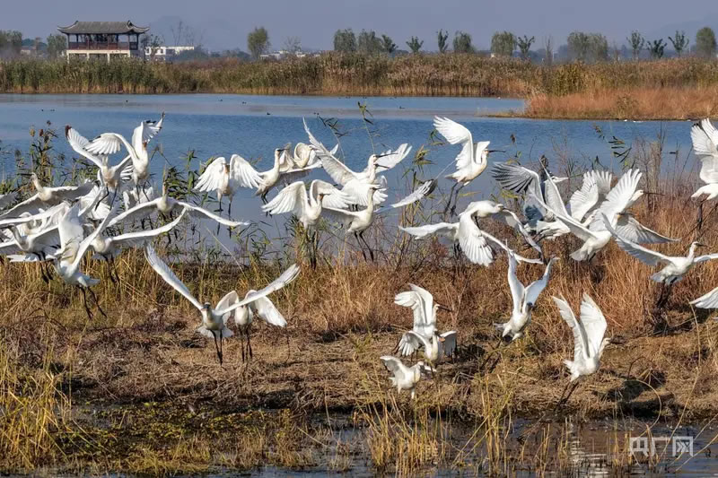 廬江縣沿黃陂湖環(huán)境綜合整治退漁還湖規(guī)劃,整治總面積近20平方公里。這群白琵鷺的翩然而至,不僅是黃陂湖濕地生態(tài)環(huán)境建設(shè)成果的生動體現(xiàn),也吸引了不少攝影愛好者和游客前來觀賞。大家紛紛在安全距離外,用鏡頭記錄下這人與自然和諧共處的美麗畫卷,見證著這片土地的蓬勃生機。