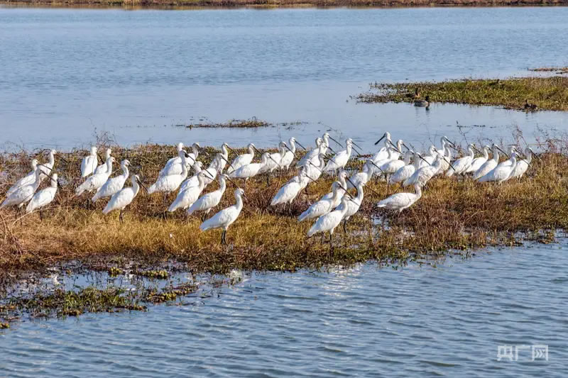 成群遷徙的白琵鷺在水中嬉戲、覓食(央廣網(wǎng)發(fā) 李紅兵攝)