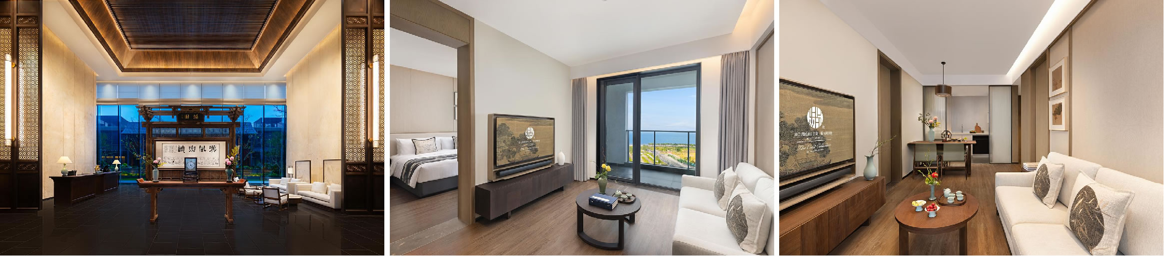 在空間設計上,物業處處藏著“宋韻密碼”:大堂借鑒宋代屏風的虛實隔斷手法,陽光透過全景落地窗與室內陳設交織,復刻出宋畫中“天光云影共徘徊”的詩意;庭院則以北宋“西園雅集”這一文人盛事為靈感,將千年風雅定格為可漫步、可體驗的園林景致。同時,物業也兼顧現代旅居需求:從單房公寓到三房復式套房,適配高凈值人群、國際商務人士、親子家庭等核心客群;客房內配備高品質家庭影院與設施齊全的廚房,滿足舒適居住需求;毗鄰海濱的地理位置,更讓住客在沉浸宋韻的同時,能輕松銜接海島風情與城市煙火,實現傳統美學與現代生活美美與共。