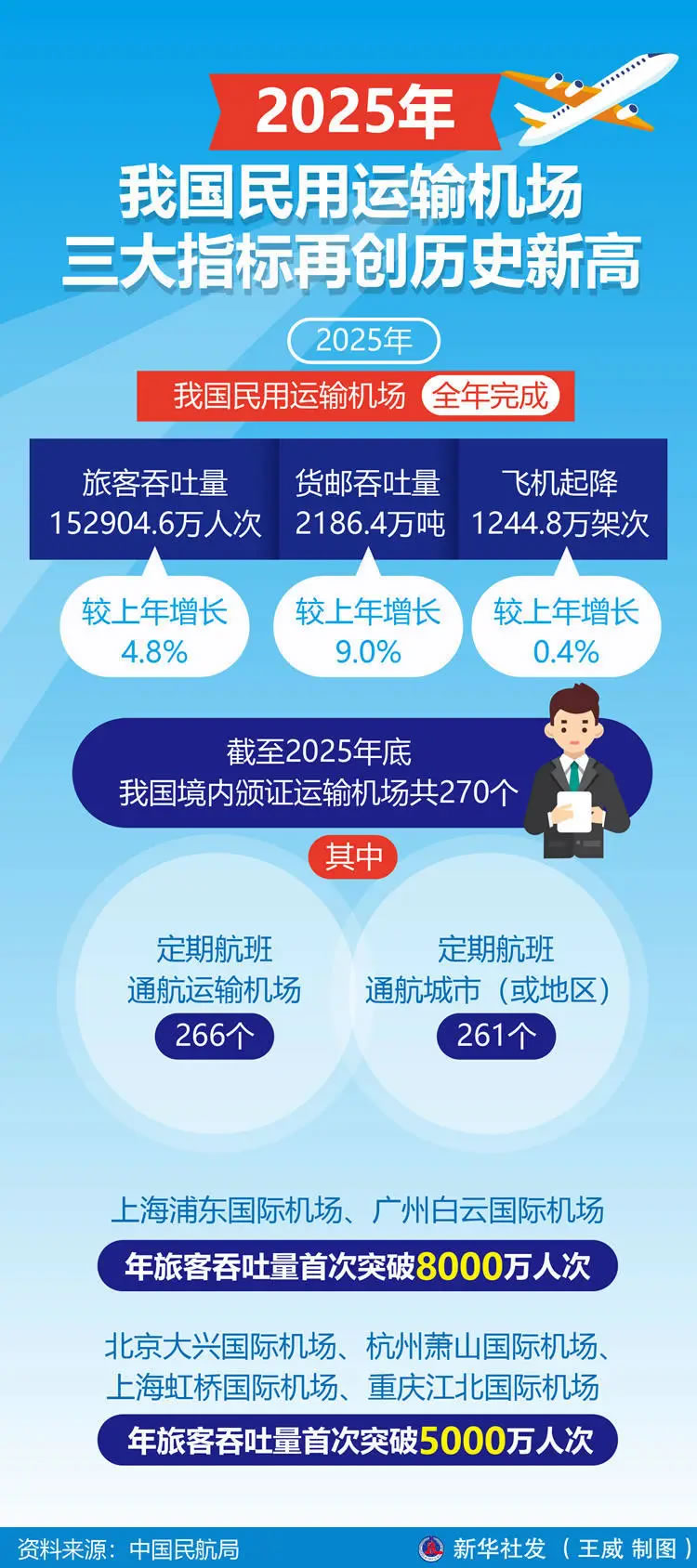 中國民航局當日公布2025年全國民用運輸機場生產統計公報。公報顯示,截至2025年底,我國境內頒證運輸機場共270個,其中定期航班通航運輸機場266個,定期航班通航城市(或地區)261個。